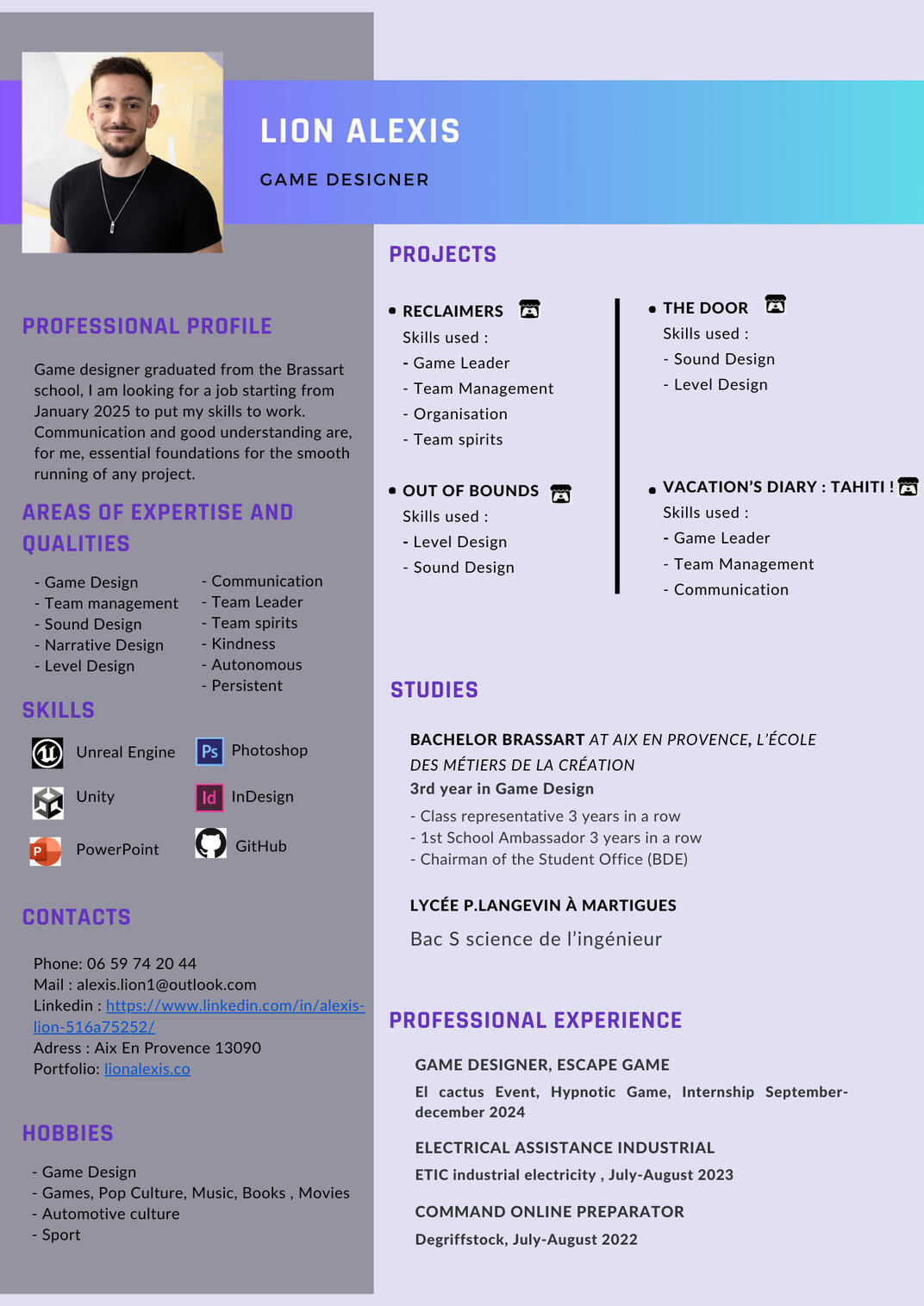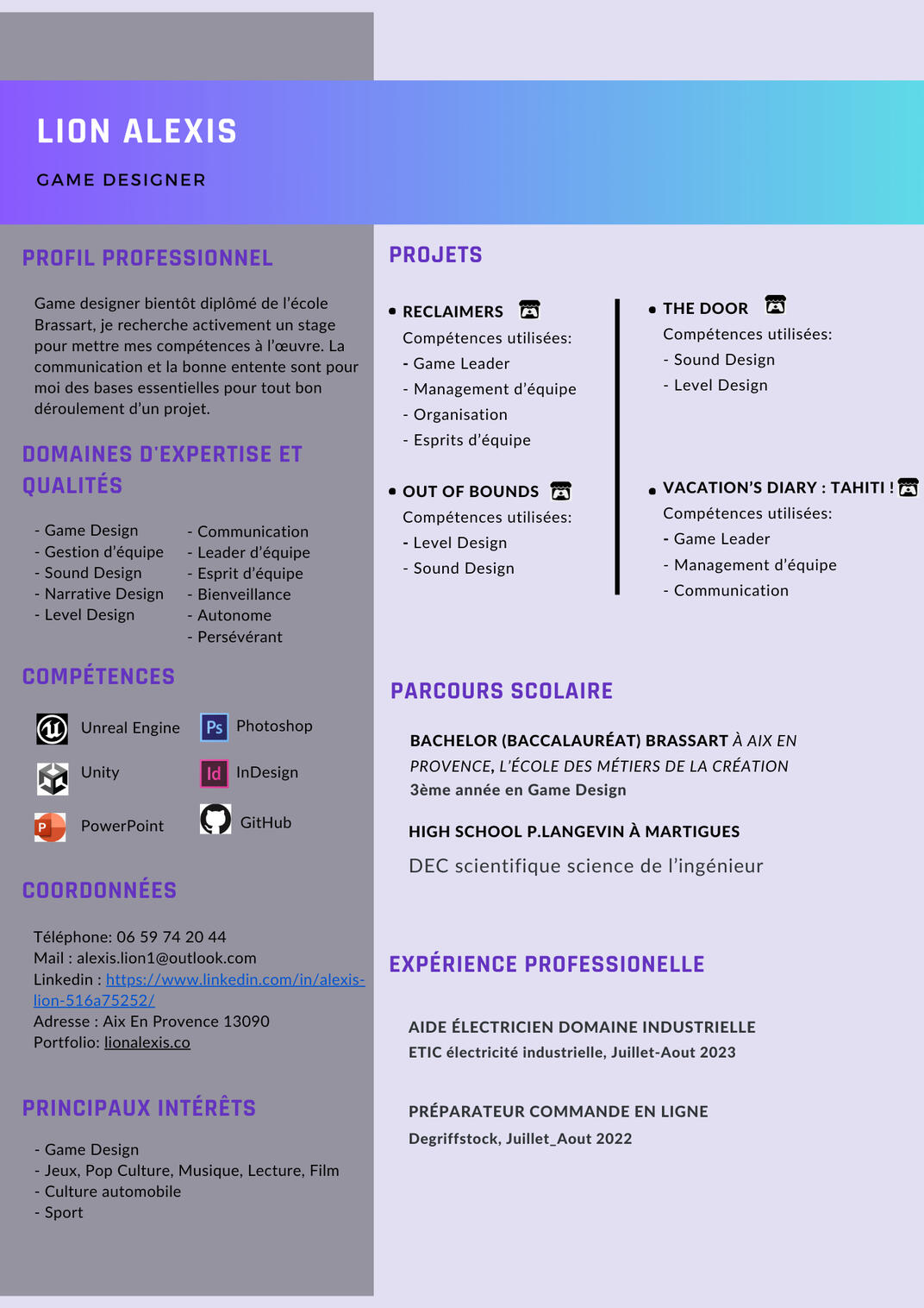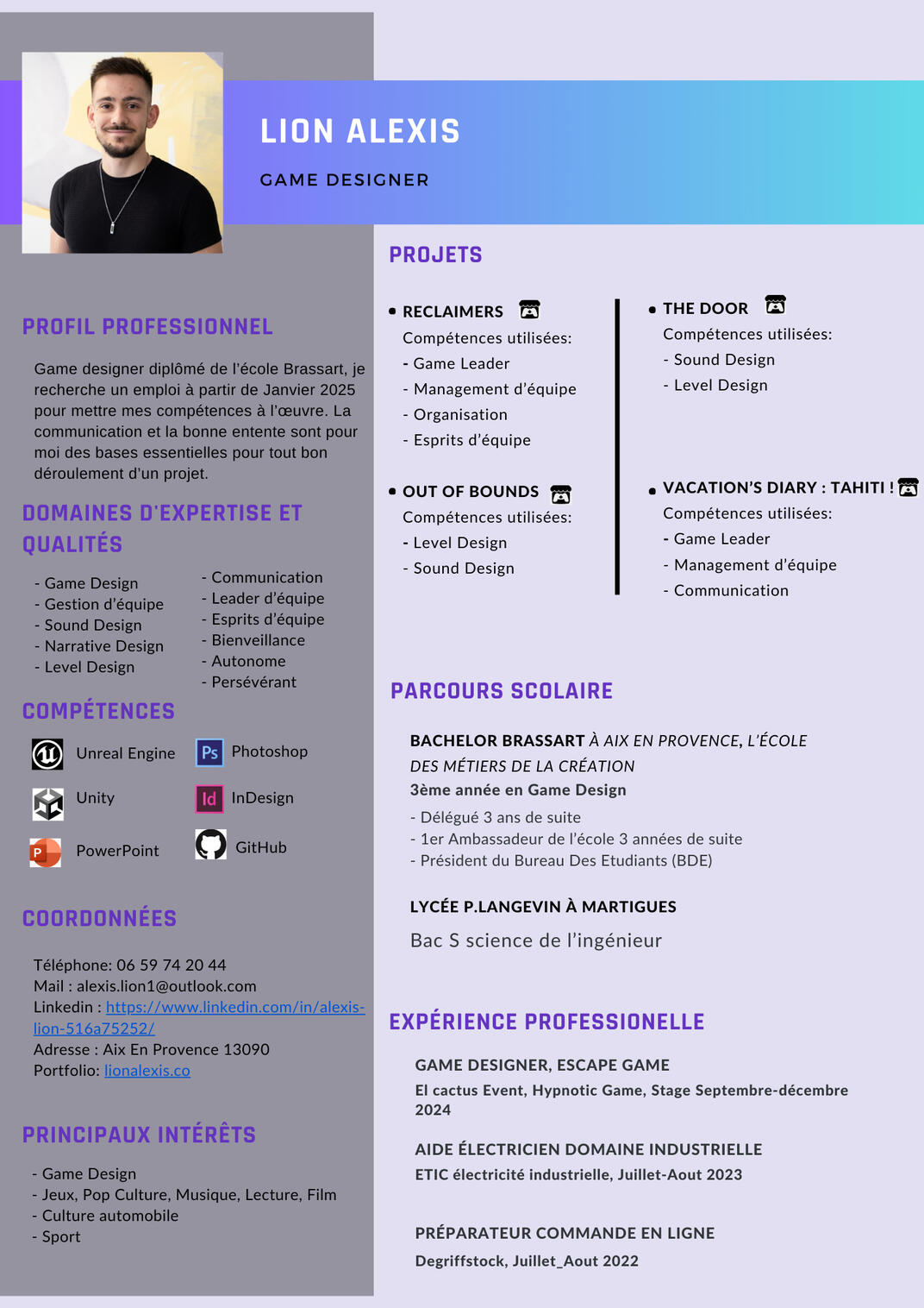 Game designer diplômé de l’école Brassart.Je recherche activement un emploi à partir de Janvier 2025 pour mettre mes compétences et mon apprentissage à l’œuvre.La communication et la bonne entente sont pour moi des bases essentielles pour tout bon déroulement d’un projet.Si mon travail vous intéresse n'hésitez pas à me contacter via ces liens et voici quelques uns des projets sur lesquels j'ai participer: